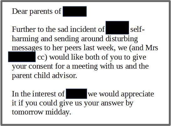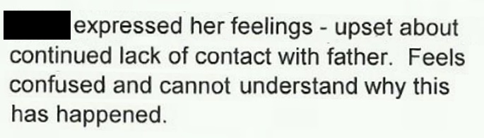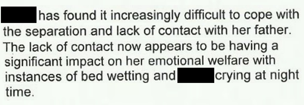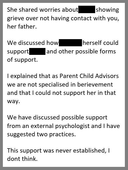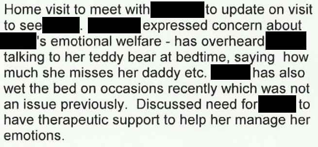Very little is known of the child’s welfare after that initial period of distress. There are, however, two emails showing that there was continuing distress four years later and then the child went through a grieving process due to the loss of her father.